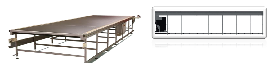 PCon Conveyor table for the automatic lays handling, made of metal structure oven varnished and wooden top for sliding of PVC belt with double side guide and metal junction. The movement is controlled by digital inverter technology with excellent synchronization of lay shifting.